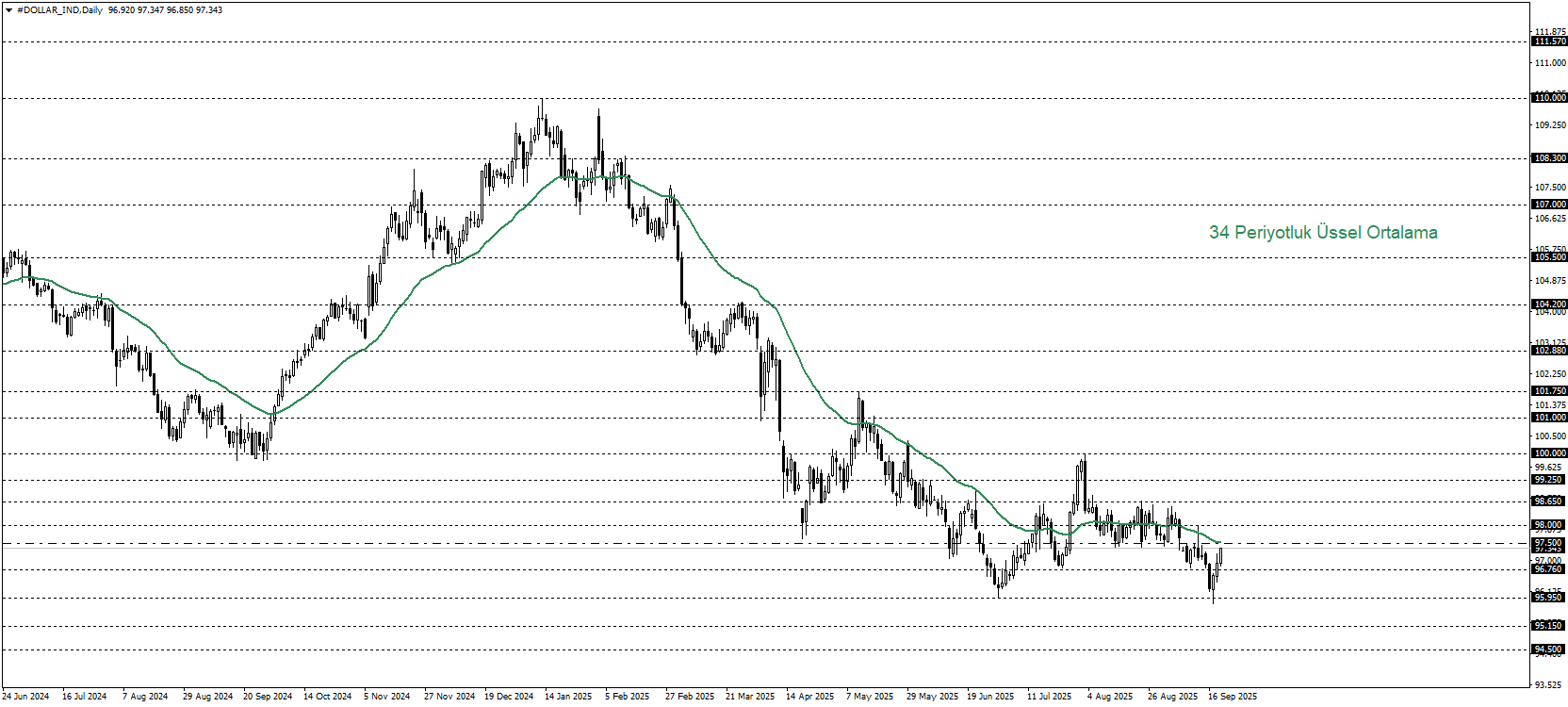 Klasik Dolar Endeksi, güncel tabloda sınırlı bir toparlanma hareketi içerisinde 97,10 seviyelerinde negatif bir görünüm sunuyor. 34 Periyotluk ortalamanın ve 97,50 güçlü direnç seviyesinin altında kalması aşağı yönlü hareketi destekleyebilir. 97,50 seviyesinin altındaki kalıcılık 96,76 destek seviyesini hedefleyebilir. 96,76 destek seviyesi kırılırsa fiyat hız kazanarak 95,95 destek seviyelerine hareketi derinleşebilir. Alternatif senaryoda, Dolar Endeksi 97,50 seviyesinin üzerinde kalıcılık sağlarsa 98,00 direncini hedefleyebilir, bu seviye de aşılırsa 98,65 direnç niteliğinde takip edilebilir. Orta vadede 97,5 üstü kalıcılık sağlaması tekrar 100 direnci gündeme gelebilir.