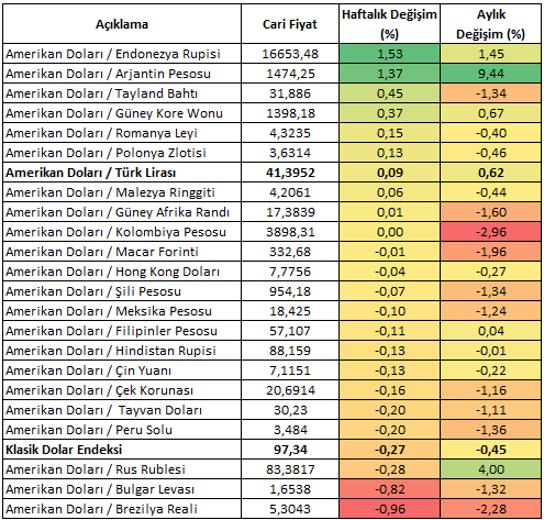 23 gelişen ülke para birimini kapsayan EMEA sepetinde ise ABD Doları karşısında ayrışma devam ediyor. Brezilya Reali en güçlü, Endonezya Rupisi en zayıf para birimi olarak kaydedilmiştir. Türk Lirası ise listenin zayıf bölgesinde yer alırken USDTRY kuru ise haftayı 41,40 seviyesine yakın kapatmaya hazırlanmaktadır.