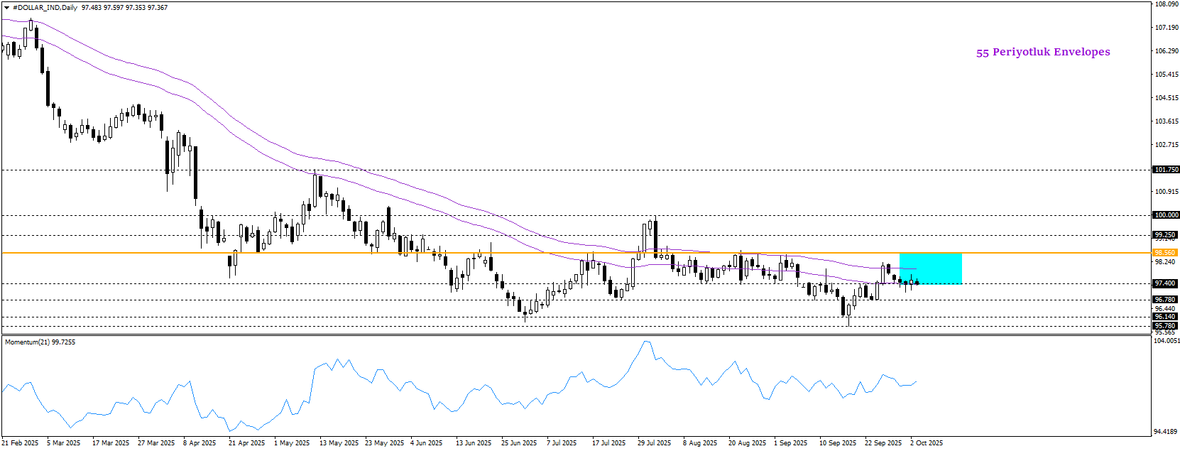 Klasik Dolar Endeksi, yıl ortasından bu yana üzerinde kalıcılık sağlayamadığı 98,56 seviyesinin altında fiyatlanmaya devam ediyor. Haftalık bazda %0,37’lik düşüş ise negatif görünümün, yatay seyir eşliğinde sürdüğüne işaret ediyor. 97,40 – 98,56 bölgesi geçilmediği sürece bu negatiflik masadan kalkmayabilir. Kısa vadede izlediğimiz bölge ve altında fiyatlandığı sürece 95,78 seviyesine yönelik geri çekilmeler oluşabilir. İzlediğimiz bölgenin üzerindeki kalıcılık gündeme pozitifliği getirerek 100 seviyesine olan hareketini başlatabilir.