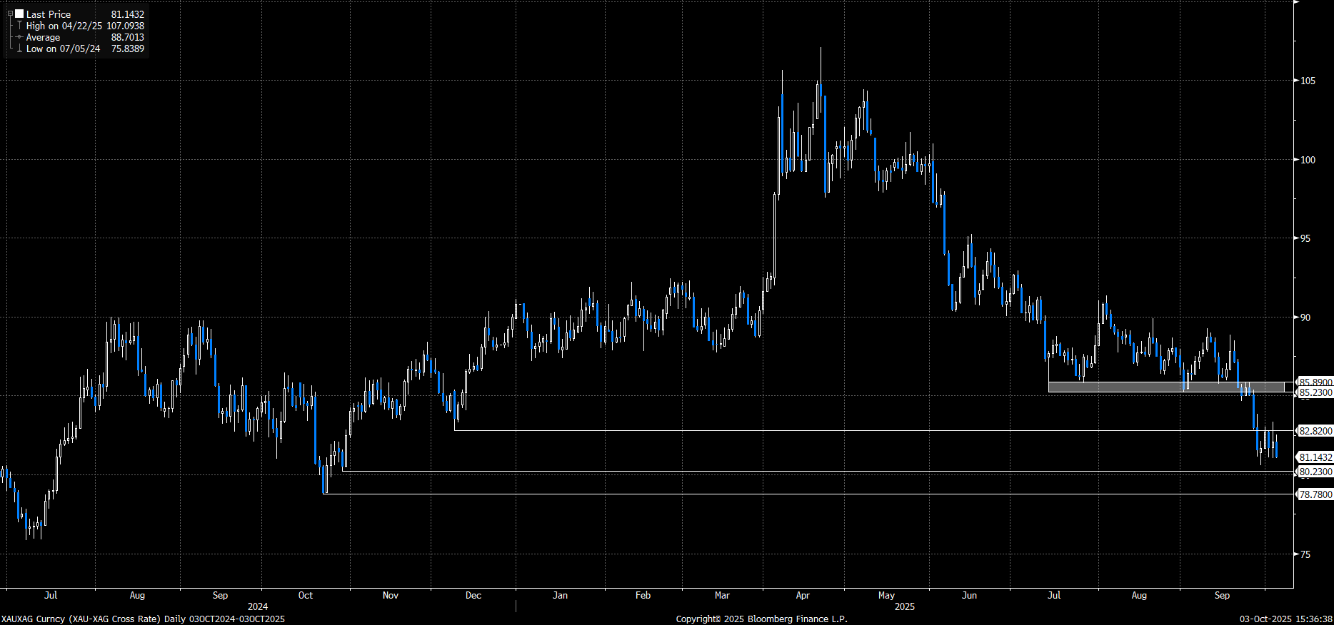 25 Eylülde gümüşün güçlenmesi ile 85,89- 85,23 bölgesinden uzaklaşan rasyoda aşağı yönlü hareket devam ediyor. Hareketin devamında 80,23 ve 78,78 seviyeleri olası düzeltme alanları olarak öne çıkıyor. Ancak altının yeniden gümüşe kıyasla güç kazanması halinde 82,82 seviyesi direnç olarak takip edilebilir. Bu seviye üzerinde kalıcılık sağlamaması seviyenin teknik anlamda önemli olduğuna işaret ediyor.