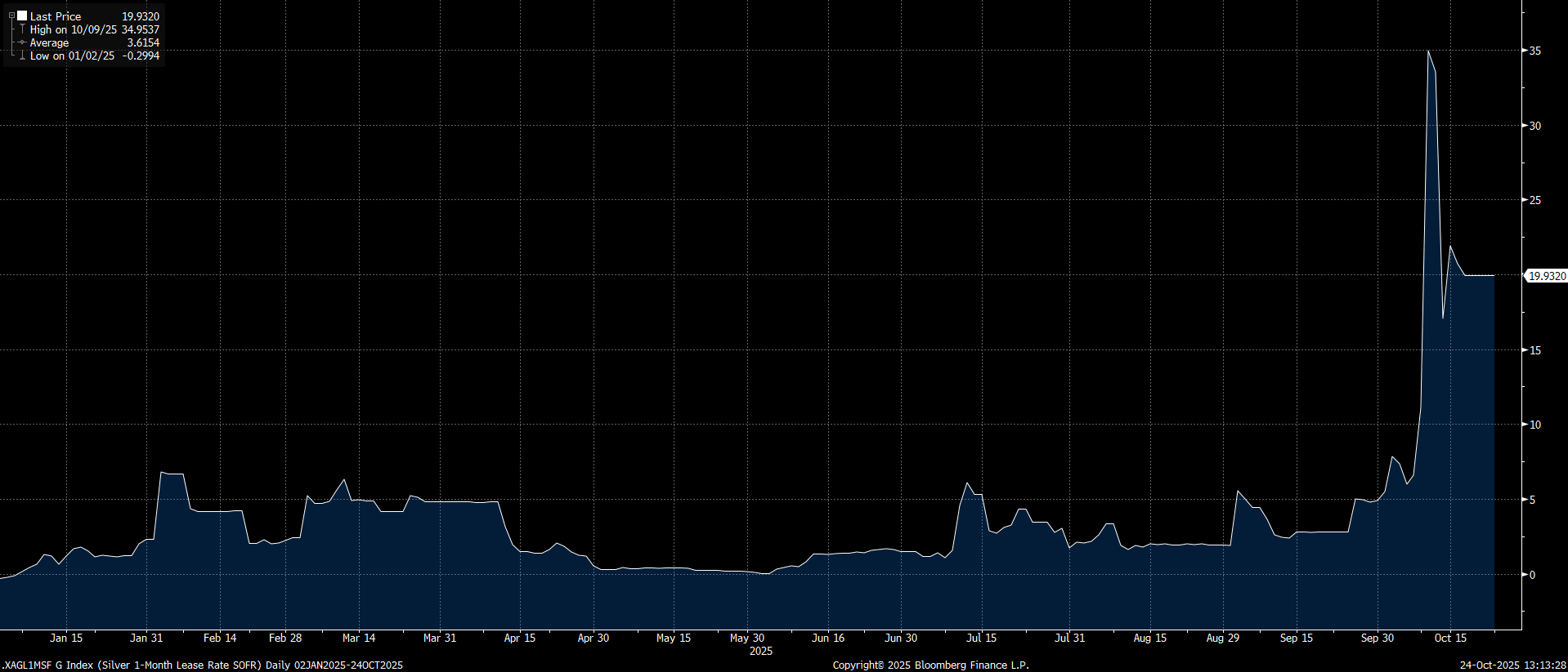 Gümüş haftayı geri çekilme ile geçirdi ve 6 Ekim seviyelerine kadar geriledi. ABD hükümetinin hala kapalı olması, Çin–ABD gerginliklerinin sürmesi ve yıl sonuna kadar toplamda 50 baz puanlık indirimin neredeyse kesin gözüyle bakılması başlıklarını takip ediyoruz. Açıklanan enflasyon rakamlarına göre çekirdek enflasyonda yavaşlama mevcut. Ayrıca, LBMA stoklarındaki düşüş ve yüksek leasing oranları arz tarafında stresin sürdüğüne işaret ediyor.