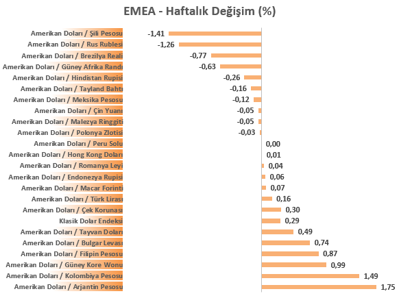 Uluslararası arenada önemli bir referans gösterge olan Dolar Endeksi, 20 – 24 Ekim haftasında pozitif performans sergiledi. Hafta başından bu yana kaydettiği iyimserlik, 24 Ekim’de saatler 15:30’u gösterdiğinde gelen ABD Enflasyon verisi ile yerini baskıya bıraktı. Ancak bu baskıya karşın haftayı kapatmaya hazırlanmaktadır. 23 gelişen ülke para birimini kapsayan EMEA sepetinde ise ABD Doları karşısında ayrışma devam etse de DXY cephesindeki son düşüşe karşın çoğunluğun hala zayıf kaldığını görmekteyiz. Haftalık bazda ABD Doları karşısında Arjantin Pesosu en zayıf, Şili Pesosu en güçlü para birimi olarak kaydedilmiştir. Türk Lirası ise listenin zayıf bölgesinde yer almakla birlikte USDTRY kuru haftayı 41,97 seviyesine yakın kapatmaya hazırlanmaktadır.