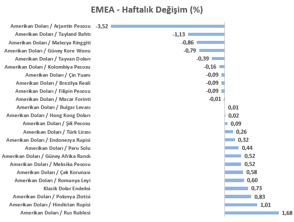 Uluslararası arenada önemli bir referans gösterge olan Dolar Endeksi, Fed’in çeyrek puan faiz indirdiği ancak devamına yönelik sinyaller vermediği, ECB ve BoJ gibi diğer majör merkez bankaların bir değişime gitmediği ve ABD’de hükümetin kapalı kalmaya devam ettiği bir süreçte 27 – 31 Ekim haftasında pozitif performans sergiledi. 23 gelişen ülke para birimini kapsayan EMEA sepetinde ise ABD Doları karşısında ayrışma devam etmektedir. Haftalık bazda Arjantin Pesosu en güçlü, Rus Rublesi en zayıf para birimi olarak kaydedilmiştir. Türk Lirası ise listenin zayıf bölgesinde yer almakla birlikte USDTRY kuru haftayı 42,05 seviyesine yakın kapatmaya hazırlanmaktadır.