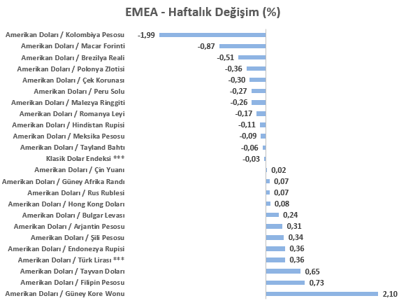Uluslararası arenada önemli bir referans gösterge olan Dolar Endeksi, bu hafta sergilediği performans ile kritik eşik bölge 100 seviyesine ulaşmakla birlikte 100 – 95 bandı tamam mı devam mı sorusuna de açıklık getirmeye çalışmaktadır. ABD’de hükümetin kapalı kalmaya devam ettiği ve bir önceki 35 günlük rekor kapanma süresinin revize gördüğü bir dönemde Kasım ayının ilk haftasını neredeyse nötr kapatmaya hazırlanmaktadır. 23 gelişen ülke para birimini kapsayan EMEA sepetinde ise ABD Doları karşısında ayrışma devam etmektedir. Haftalık bazda Kolombiya Pesosu en güçlü, Güney Kore Wonu en zayıf para birimi olarak kaydedilmiştir. Türk Lirası ise listenin zayıf bölgesinde yer almakla birlikte USDTRY kuru haftayı 42,21 seviyesine yakın kapatmaya hazırlanmaktadır.
