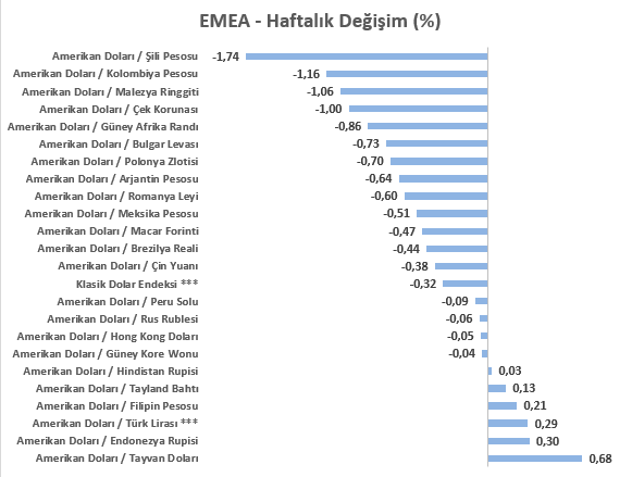 23 gelişen ülke para birimini kapsayan EMEA sepetinde ise ABD Doları karşısında ayrışma devam etmektedir. Haftalık bazda Şili Pesosu en güçlü, Tayvan Doları en zayıf para birimi olarak kaydedilmiştir. Türk Lirası ise listenin zayıf bölgesinde yer almakla birlikte USDTRY kuru haftayı 42,33 seviyesine yakın kapatmaya hazırlanmaktadır.