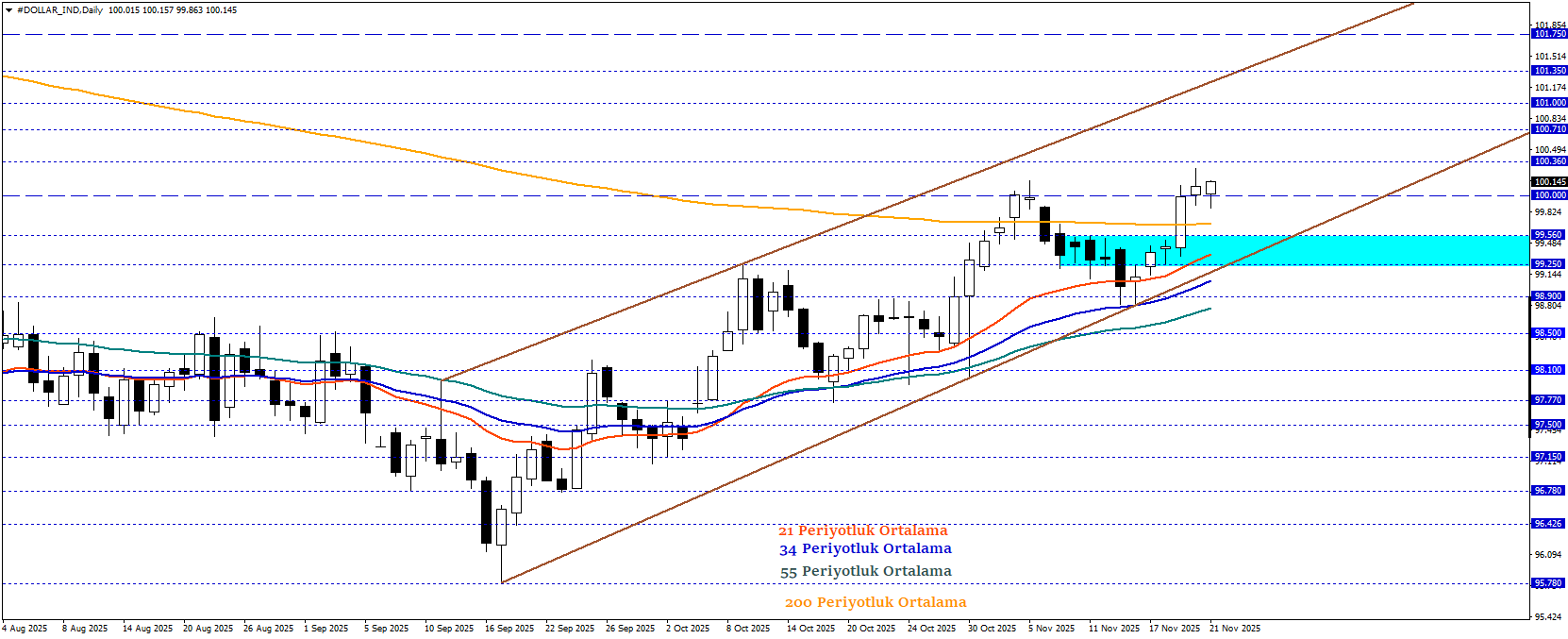 Klasik Dolar Endeksi, Eylül ortasından itibaren sürdürdüğü yükselişini 100,00 seviyelerinde koruyarak pozitif görünümünü sürdürüyor. Endeksin 99,56 – 99,25 seviyesi üstünde fiyatlanmaya devam etmesi durumunda, 101,75 seviyesine doğru hareket potansiyeli gündemde kalmayı sürdürebilir. Özellikle 100 psikolojik seviyesinin üzerine kalıcıkla geçmesi endeksin pozitif görünümüne ivme sağlayabilir. Endeks, olumlu senaryosunu yitirebilmesi için 99,56 – 99,25 altındaki kalıcılık gerçekleşmesi ve 97,77 seviyesine doğru geri çekilme hareketi oluşması beklenebilir.