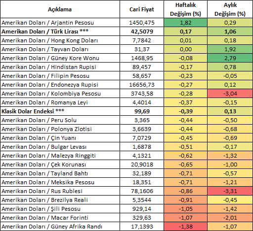 Haftalık bazda Güney Afrika Randı en güçlü, Arjantin Pesosu ise en zayıf para birimi olarak kaydedilmiştir. Türk Lirası ise listenin zayıf bölgesinde yer almakla birlikte USDTRY kuru 42,50 seviyesine yakın haftayı kapatmaya hazırlanmaktadır.
