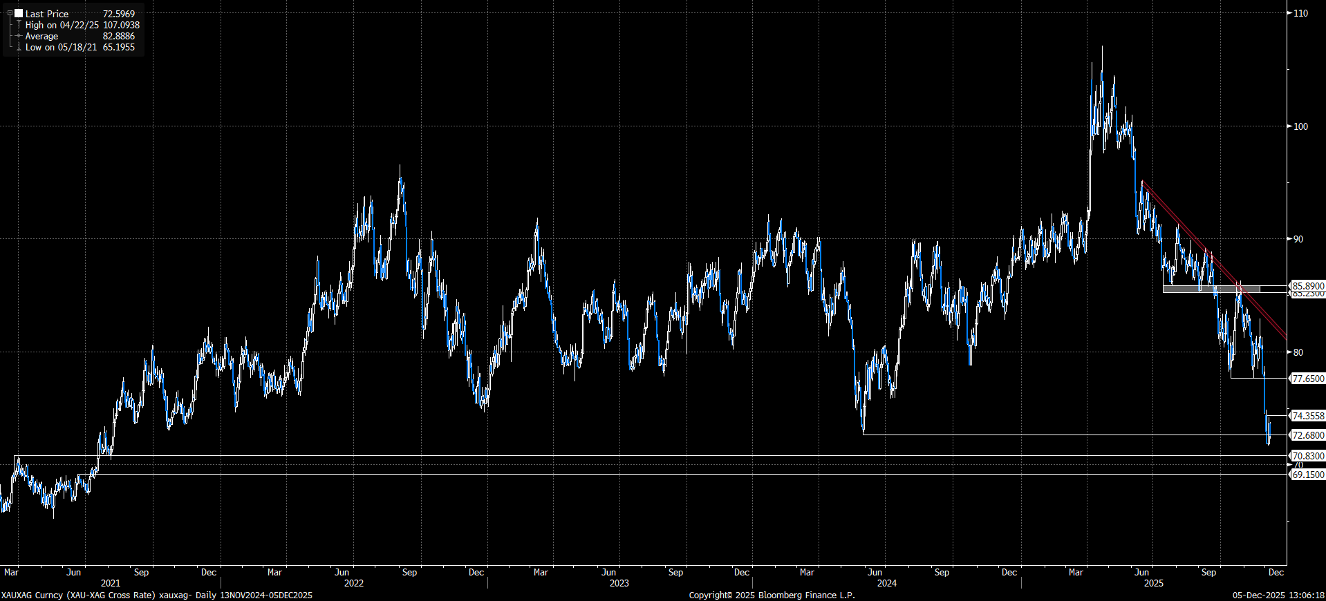 Geçen hafta sergilediği güçlü yükseliş ivmesini koruyan ve yeni zirveler oluşturan gümüş, altın/gümüş rasyosundaki düşüşün sürmesine yol açıyor. Uzun süredir altına göre daha iyi bir performans gösteren gümüş sayesinde rasyo 72,68 seviyesinin de altına inerek (Mayıs 2024) 2021 yazındaki seviyelere kadar geriledi ancak henüz kalıcılık sağlayamadı. Genel görünüm aşağı yönü işaret etmeye devam etse de, rasyoda kısa vadede bir düzeltme hareketi görülmesi mümkün. Böyle bir durumda ilk olarak 74,35 sonrasında ise 77,65 seviyelerini takip ediyor olacağız.