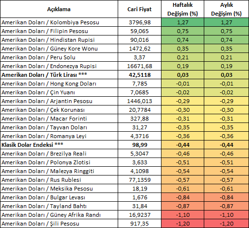 Klasik Dolar endeksi, hafta genelinde sergilediği baskı ile psikolojik 100 seviyesi altındaki seyrine devam etmekte ve haftayı da 99 seviyesinin altında kapatmaya hazırlanmaktadır. Tabii Fed Enflasyon göstergesi PCE verisinin TR saatiyle 18:00’de açıklanması ile birlikte oluşabilecek hareket akışı da ayrıca takip edilmelidir. 23 gelişen ülke para birimini kapsayan EMEA sepetinde ise ABD Doları karşısında 1 – 5 Aralık haftasında ayrışma devam etmektedir. Haftalık bazda Şili Pesosu en güçlü, Kolombiya Pesosu ise en zayıf para birimi olarak kaydedilmiştir. Türk Lirası ise listenin zayıf bölgesinde yer almakla birlikte USDTRY kuru 42,51 seviyesine yakın haftayı kapatmaya hazırlanmaktadır.