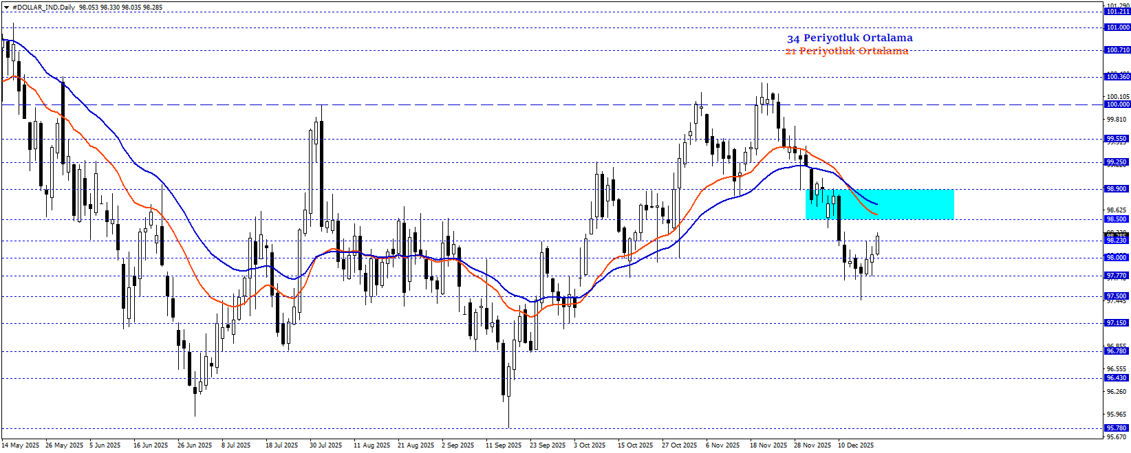Klasik Dolar Endeksi son dönemde 98 civarında zayıf bir görünüm sergiliyor. Endeksin ortalamaların da desteklediği 98,50–98,90 aralığının altında kalması, fiyatların 95,78 seviyesine doğru gerileyebileceği riskini gündemde tutuyor. Ancak bu bölgenin aşılması halinde endeksin güç kazanarak toparlanması ve 100 psikolojik seviyesine yönelmesi de mümkün görünüyor; bu nedenle kısa vadeli eğilim açısından söz konusu seviyeler kritik önem taşıyor.