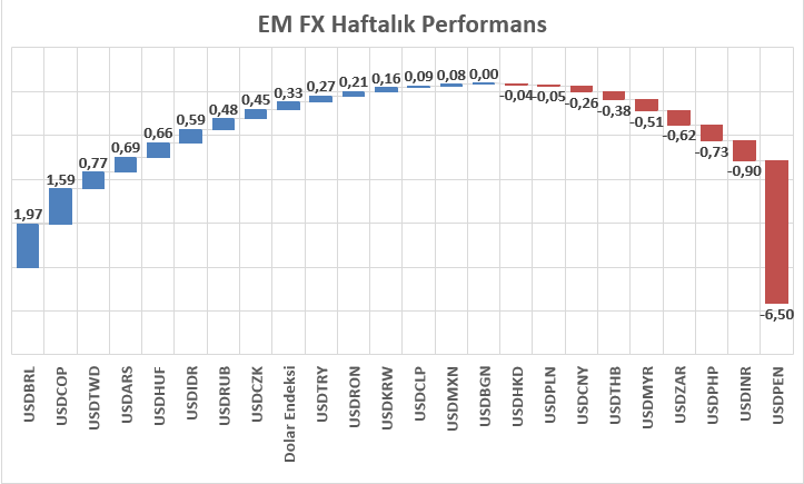 Dolar Endeksi (DXY), haftanın geneline ilişkin sınırlı kazanım ile 98 seviyesi üzerinde kalmaya çabalamaktadır. Negatif eğilimin ardından bu bölge üzerindeki tutunma çabası, kısa vadeli fiyatlamalar açısından toparlanma sinyali olarak izlenebilir. Asya, Latin Amerika ve EMEA bölgelerinden 23 gelişmekte olan ülke para birimini kapsayan EM FX sepetinde ABD Doları karşısında göreli performans farklılaşması devam etmektedir. Haftalık bazda en zayıf performans Brezilya Realinde izlenirken, en güçlü performans Peru Solunda kaydedilmiştir. Türk Lirası ise sepet genelinde görece zayıf tarafta konumlanmaya devam etmektedir. USDTRY kuru, analizin hazırlandığı saatler itibarıyla 42,80 seviyesine yakın işlem görmektedir.