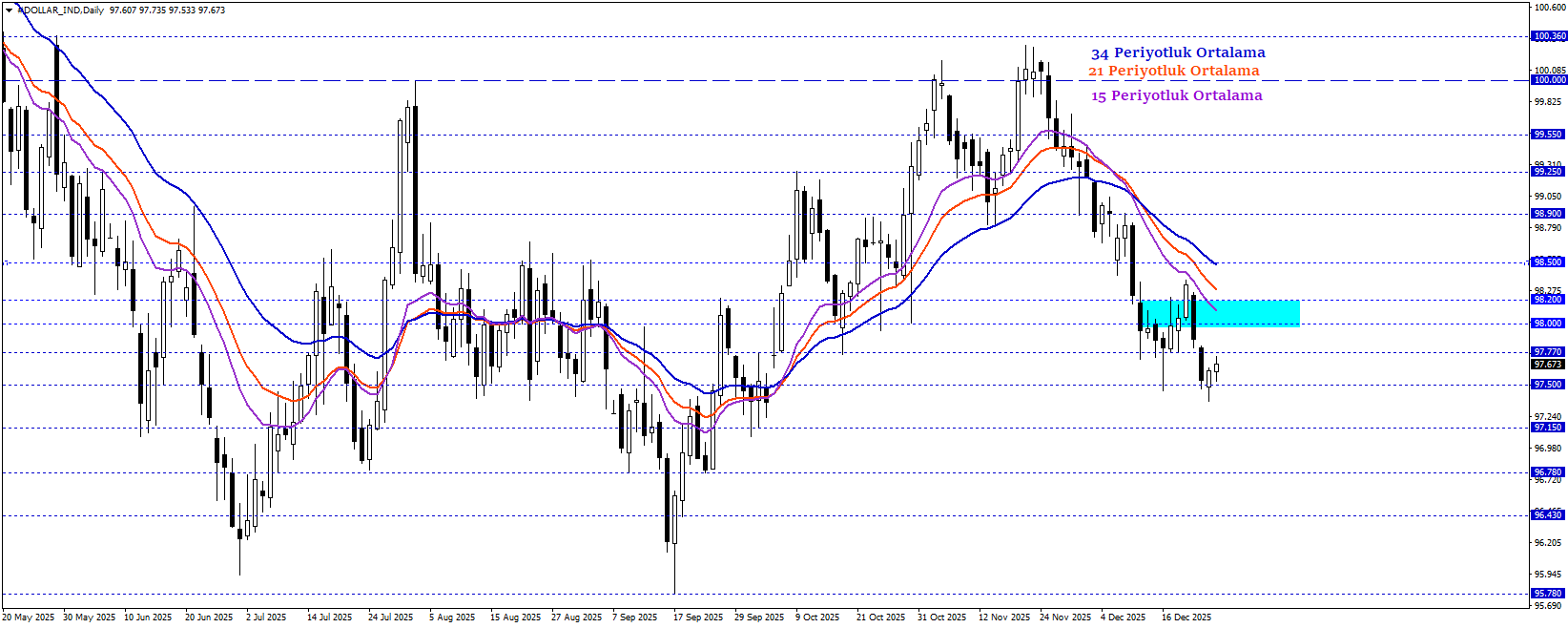 Klasik Dolar Endeksi son dönemde 97,65 civarında zayıf bir görünüm sergiliyor. Endeksin 15 periyotluk ortalamanın da desteklediği 98,00–98,20 aralığının altında kalması, fiyatların 95,78 seviyesine doğru harekti gündemde tutuyor. Ancak takip edilen bölgenin aşılması halinde endeksin güç kazanarak toparlanması ve 100 psikolojik seviyesine yönelmesi de mümkün görünüyor; bu nedenle kısa vadeli eğilim açısından söz konusu seviyeler kritik önem taşıyor.