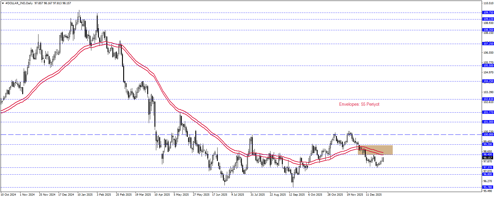 Klasik Dolar Endeksi son dönemde 98,00 civarında zayıf bir görünüm sergiliyor. Endeksin 55 periyotluk ortalamanın da desteklediği 98,40–99,20 aralığının altında kalması, fiyatların 95,78 seviyesine doğru harekti gündemde tutuyor. Ancak takip edilen bölgenin aşılması halinde endeksin güç kazanarak toparlanması ve 100 psikolojik seviyesine yönelmesi de mümkün görünüyor; bu nedenle kısa vadeli eğilim açısından söz konusu seviyeler kritik önem taşıyor.