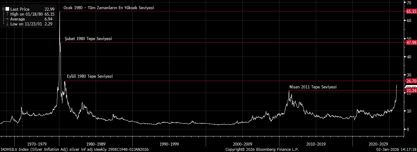 2025’teki çok güçlü performansın ardından, gümüşün enflasyona göre düzeltilmiş fiyatı Nisan 2011 seviyesinin üzerine taşındı. Geçtiğimiz hafta yaşanan sert geri çekilmeye rağmen 2011’in aşılması, uzun vadeli direnç seviyesinin geride bırakıldığına ve yukarı yönlü hareketin teknik olarak güç kazandığına işaret ediyor. Şimdi Eylül 1980’de oluşmuş olan 26,70 tepe seviyesini yakından takip ediyoruz.