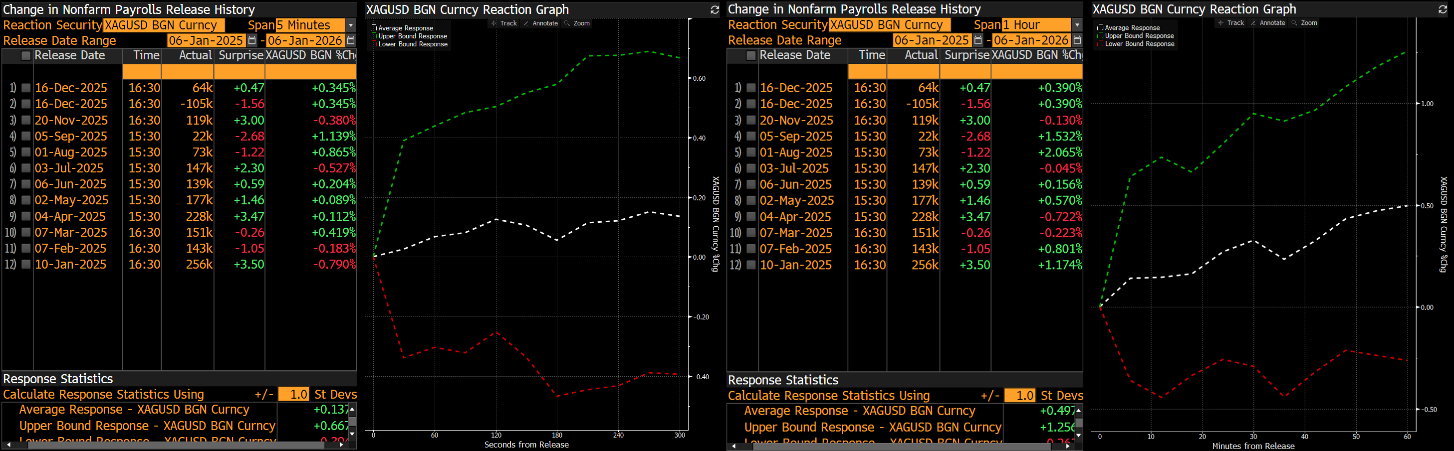 Gümüş, istihdam verisi sonrası ilk dakikalarda yönlü ama sınırlı bir tepki verirken, beklentinin altında kalan verilerde yükselişin 30–60 dakika içinde belirgin şekilde güçlendiği izleniyor. Güçlü istihdam verilerinde ise ilk şokun ardından hareketin zayıfladığı ve kalıcılığın azaldığı görülüyor. Genel olarak ilk hareket sınırlı kalırken, asıl yön faiz ve dolar beklentilerinin netleştiği ilk saat içinde oluşuyor. Bu da gümüşün istihdam verisini doğrudan değil, para politikası beklentileri üzerinden fiyatladığını gösteriyor.