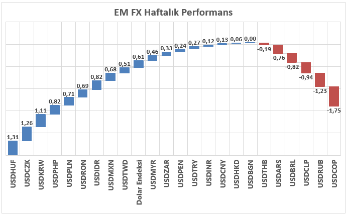 Yeni yılın ilk haftası geride kalırken, küresel piyasalarda ABD Doları lehine görünümün korunduğu izlenmektedir. Özellikle ABD–Venezuela hattında jeopolitik gerilimin artmasıyla birlikte riskten kaçış eğilimi ön plana çıkarken, Klasik Dolar Endeksi’nin 97,40 seviyesi üzerinde tutunma çabası bu eğilimin teknik olarak da sürdüğüne işaret etmektedir. Asya, Latin Amerika ve EMEA bölgelerinden gelişmekte olan ülke para birimlerini kapsayan EM FX sepetinde ise haftalık bazda ABD Doları karşısında genel olarak zayıf bir performans dikkat çekmektedir. Sepet içerisinde en zayıf performans sağlayan para birimi Macar Forinti olarak izlenirken, en güçlü para birimi Kolombiya Pesosu olmuştur. Türk Lirası ise sepet içerisinde zayıf tarafta konumlanmaya devam ederken, USDTRY kuru 43,15 seviyesine yakın haftayı kapatmaya hazırlanmaktadır.