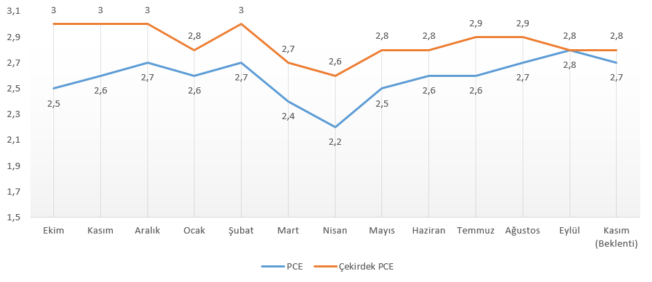 Eylül ayına ilişkin PCE enflasyonu aylık 0,3% artış gösterirken, yıllık rakam 2,7%’en 2,8%’e yükselmişti. Çekirdek PCE enflasyonu aynı dönemde 0,2% artarken, yıllık rakam 2,9%’dan 2,8%’e gerilemişti.
