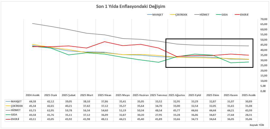 Bununla birlikte enflasyon seviyesinin hâlen yüksek seyrettiği, çekirdek göstergelerdeki katılık ve fiyatlama davranışlarının hassasiyetin para politikasında temkinli bir yaklaşımı gerekli kıldığı unutulmamalıdır. Son bir yıllık enflasyon görünümüne baktığımızda enflasyon içerisindeki detay kalemlerin performansı, yaz aylarından itibaren sergilediği dalgalanmaları da dikkate aldığımızda sıkılığın korunmasının önemini açık şekilde ortaya koymaktadır.