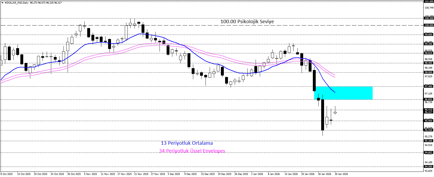 Klasik Dolar Endeksi, 96,50 seviyesi etrafında aşağı yönlü görünümünü korumakta olup haftalık bazda yaklaşık %0,50 değer kaybı ile haftayı kapatmaya zemin tutuyor. 96,85 – 97,40 bölgesi altında seyir devam ettiği sürece, 94,00 seviyesine kadar geri çekilme sürebilir. Öte yandan izlenen alanının yukarı yönlü kalıcılık sağlanması halinde, toparlanma 100,00 seviyesine doğru hareket başlayabilir.