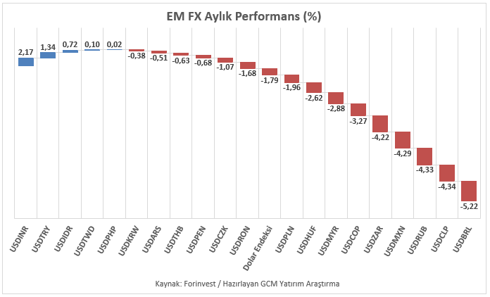 Asya, Latin Amerika ve EMEA bölgelerinden seçili gelişmekte olan ülke para birimlerini içeren EM FX sepetinde aylık bazda ABD Doları karşısında göreceli performans farklılaşmasının sürdüğü görülmektedir. Sepetin büyük bir bölümünün Dolar karşısında güçlü kalmayı başardığı izlenirken, Brezilya Reali pozitif ayrışan para birimleri arasında yer almıştır. Buna karşılık Hindistan Rupisi zayıf görünümüyle negatif ayrışmıştır. Türk Lirası ise EM FX sepeti içerisinde zayıf tarafta konumlanmayı sürdürürken, USDTRY kuru kontrollü ve kademeli görünümünü koruyarak haftayı ve ayı 43,50 seviyesine yakın tamamlamaya hazırlanmaktadır.