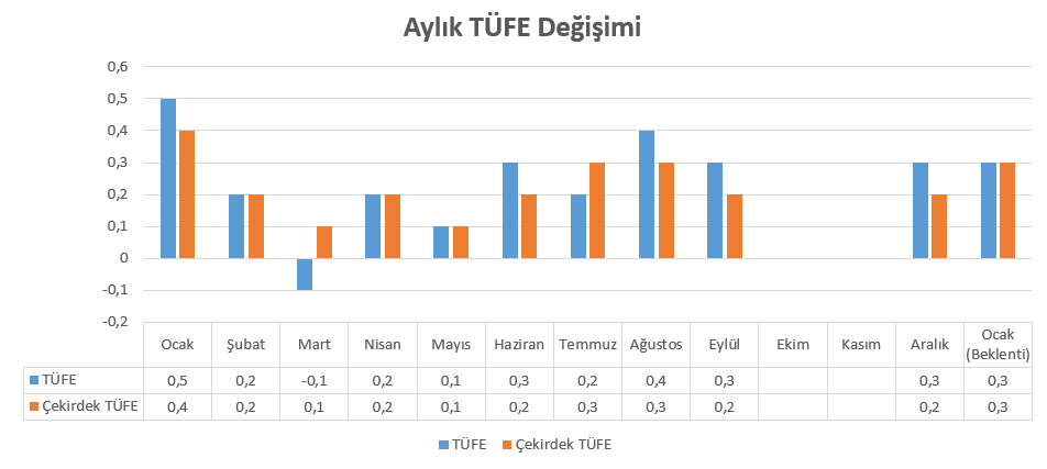 Yıllık enflasyondaki ılımlı görünüme karşın aylık TÜFE değişimine dikkat etmekte fayda var. Aylık TÜFE değişimleri Aralık ayında manşet tarafında 0,3% gibi hala yüksek seviyelerde olurken, çekirdek enflasyon daha ılımlı bir tablo çizmişti. Burada dikkat edilmesi gereken şey, aylık TÜFE değişimlerinin aslında daha güncel tabloyu göz önüne sermesi. Yıllık enflasyon önceki yılın aynı döneminde görülen daha yüksek enflasyon seviyeleri nedeniyle bu durumu arka planda bırakabiliyor.