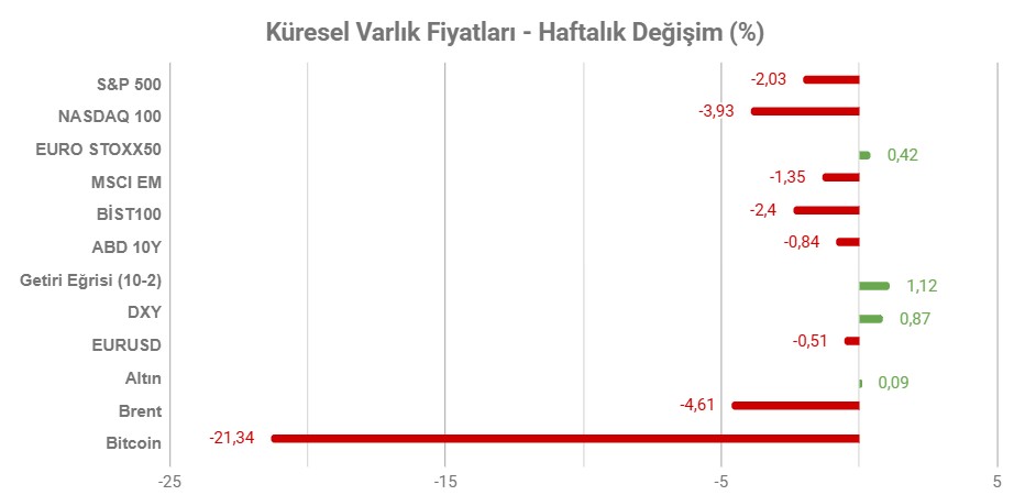Risk iştahındaki baskılanma özellikle Bitcoin tarafında sert satışlara neden olurken, petrol ABD – İran görüşmesine ilişkin iyimserlikle baskılandı. Dolar endeksi ve gelişmekte olan ülke endeksleri sepeti bu hafta pozitif ayrıştı. Nasdaq yapay zeka sektörü kırılganlığıyla 4%’e yakın kayıp yaşadı.