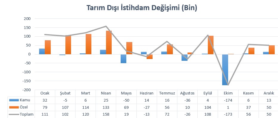 Yemek hizmetleri, sağlık hizmetleri ve sosyal yardım sektörü 65 bin civarında istihdam katkısı sağlarken, perakende ticarette 25 bin civarında istihdam kaybı yaşandı. Bu da faiz ortamının kısıtlayıcı etki oluşturduğu düşüncesini öne çıkardı. 2025 yılında istihdam artışı ortalaması 49 bin oldu.