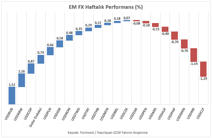 Klasik Dolar Endeksi (DXY), 2014 Eylül ayından bu yana referans alınan 200 aylık üstel hareketli ortalama (95,55) seviyesinden destek bularak son dönemdeki düşüşlerini sınırlandırmış ve yeni aya bu kritik gösterge üzerinde başlamıştır. Asya, Latin Amerika ve EMEA bölgelerinden seçili gelişmekte olan ülke para birimlerini içeren EM FX sepetinde ise haftalık bazda ABD Doları karşısında göreceli performans farklılaşmasının sürdüğü görülmektedir. Bu süreçte Şili Pesosu pozitif ayrışan para birimleri arasında yer alırken, Rus Rublesi zayıf görünümüyle negatif ayrışmıştır. Türk Lirası ise EM FX sepeti içerisinde zayıf tarafta konumlanmayı sürdürürken, USDTRY kuru kademeli görünümünü koruyarak haftayı 43,61 seviyesine yakın tamamlamaya hazırlanmaktadır.