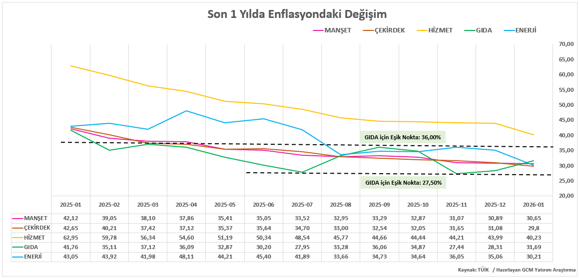 GCM Yatırım Araştırma Departmanı olarak TCMB’nin 12 Mart politika açıklamasında politika faizinde 100 baz puan indirime gidebileceğini düşünüyoruz. Ancak bu aşamada TÜFE değişimleri de önemli olacaktır. Aylık TÜFE değişimlerinin özellikle yeni metodolojiyle ağırlığın kaydığı hizmet maliyetleri ve güncel olarak öne çıkan gıda maliyetlerinin yapışkanlığı işaret etmesi, TCMB’nin daha temkinli bir tutum sergilemesine neden olabilir.