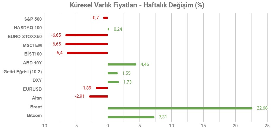 Geride bıraktığımız 2 – 6 Mart haftası, küresel ve yerel piyasalarda jeopolitik gerilimlerin baskın olduğu bir dönemdi. Orta Doğu’da ABD ve İsrail’in İran’a yönelik hava saldırılarıyla başlayan çatışma, hafta boyunca enerji piyasalarını ve risk algısını etkiledi. Hürmüz Boğazı trafiğinin kesintiye uğraması tehdidiyle birlikte petrol fiyatları sert şekilde yükseldi. Altın güvenli varlık talebiyle toparlanma gösterdi. Bu gelişmeler, enerji maliyetlerini yukarı iterken, maliyet enflasyonu ve küresel tedarik zinciri risklerini artırdı.
