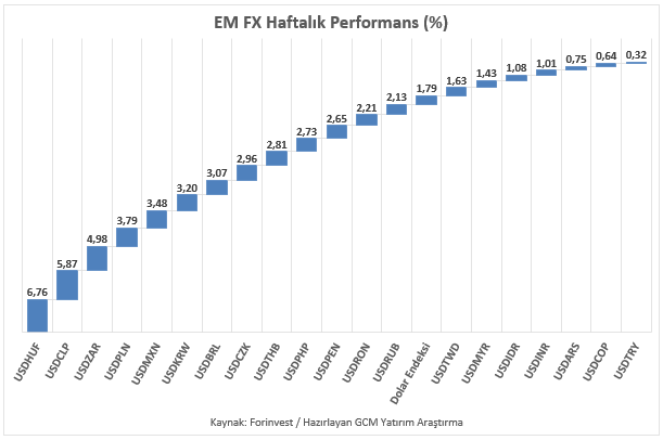 Asya, Latin Amerika ve EMEA bölgelerinden seçili gelişmekte olan ülke para birimlerini içeren EM FX sepetinde haftalık bazda performans farklılaşması devam etmektedir. Dolar’ın güçlü seyri sebebiyle sepetin tamamı zayıf bir performans sergilemiştir. Macar Forinti listenin en zayıf para birimi olarak görülürken, Türk Lirası listenin zayıf tarafında en az baskı ile konumlanmayı sürdürmüş, USDTRY kuru kademeli yükseliş eğilimini koruyarak haftayı 44,07 seviyesine yakın tamamlamaya hazırlanmıştır