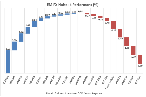 Klasik Dolar Endeksi (DXY), ABD& İsrail – İran jeopolitik risk temasının devam etmesi ile birlikte psikolojik 100 / teorik 100,35 bölgesine ulaştıktan sonra hareket akışını sınırlı tuttu ve haftayı 99,30 seviyesinde ve yüzde 1’in üzerinde negatif performans ile kapattı. Asya, Latin Amerika ve EMEA bölgelerinden seçili gelişmekte olan ülke para birimlerini içeren EM FX sepetinde haftalık bazda performans farklılaşması devam etmektedir. Rus Rublesi listenin en zayıf para birimi olarak görülürken, Polonya Zlotisi pozitif ayrışan para birimi olarak kaydedilmiştir. Türk Lirası listenin zayıf tarafında konumlanmayı sürdürmüş, USDTRY kuru kademeli yükseliş eğilimini koruyarak haftayı 44,30 seviyesine yakın tamamlamıştır.