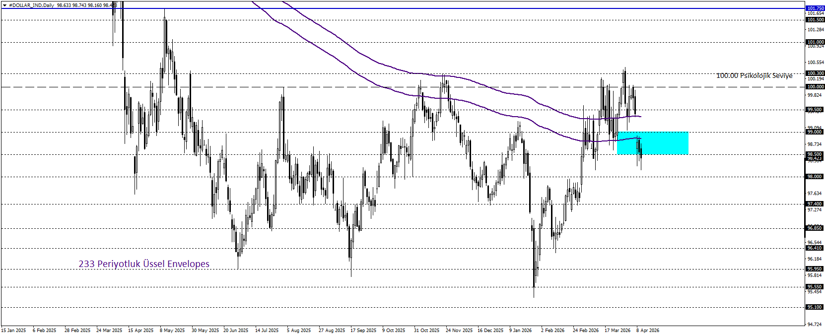 Klasik Dolar Endeksi son dönemde 98,40 civarında zayıf bir görünüm sergiliyor. Endeksin Envelopes göstergesinin de desteklediği 99,00 – 98,50 aralığının altında kalması, fiyatların 96,85 seviyesine doğru gerileyebileceği riskini gündemde tutuyor. Ancak bu bölgenin aşılması halinde endeksin güç kazanarak toparlanması ve 101 seviyesine yönelmesi de mümkün görünüyor; bu nedenle kısa vadeli eğilim açısından söz konusu seviyeler kritik önem taşıyor.