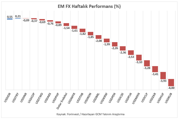 ABD – İran jeopolitik risk temasında ateşkes süreci ve İsrail özelinde ateşkese ilişkin riskler gündemimizi meşgul etmeyi sürdürürken sürece ilişkin yapılacak görüşmeler ve yeni döneme ilişkin verilecek mesajlar piyasalar için önemli kalmayı sürdürmektedir. Klasik Dolar Endeksi (DXY), ateşkes iyimserliğiyle psikolojik 100,00 / teorik 100,35 bölgesinden uzaklaşarak kontrol noktası 97,95 seviyesine yaklaşan bir profil izledi ve haftayı negatif performans ile kapatmaya hazırlanmaktadır. Asya, Latin Amerika ve EMEA bölgelerinden seçili gelişmekte olan ülke para birimlerini içeren EM FX sepetinde haftalık bazda performans farklılaşması devam etmektedir. Özellikle çoğu ülke para biriminin Dolar karşısında güçlü kalması dikkat çekmektedir. Rus Rublesi listenin en güçlü para birimi olarak görülürken, Endonezya Rupisi negatif ayrışan para birimi olarak kaydedilmiştir. Türk Lirası listenin zayıf tarafında konumlanmayı sürdürmüş, USDTRY kuru kademeli yükseliş eğilimini koruyarak haftayı 44,67 seviyesine yakın tamamlamıştır.