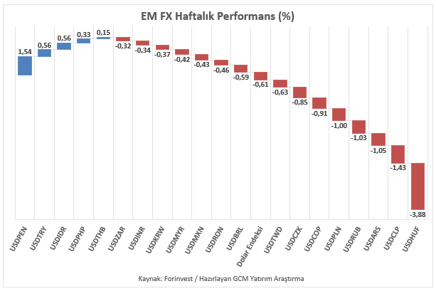 Asya, Latin Amerika ve EMEA bölgelerinden seçili gelişmekte olan ülke para birimlerini içeren EM FX sepetinde haftalık bazda performans farklılaşması devam etmektedir. Özellikle çoğu ülke para biriminin Dolar karşısında güçlü kalması dikkat çekmektedir. Macar Forinti listenin en güçlü para birimi olarak görülürken, Peru Solu negatif ayrışan para birimi olarak kaydedilmiştir. Türk Lirası listenin zayıf tarafında konumlanmayı sürdürmüş, USDTRY kuru kademeli yükseliş eğilimini koruyarak haftayı 44,86 seviyesine yakın tamamlamaya hazırlanmaktadır.