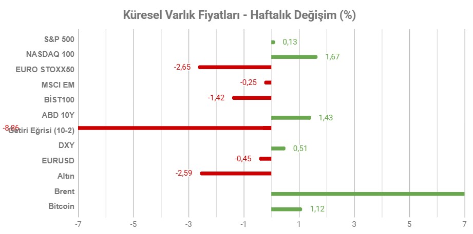 ABD ile İran arasında iki haftalık ateşkes sürecinin ardından Pakistan’daki görüşmelerde sonuç alınamaması, özellikle Hürmüz Boğazı krizinin daha da uzayacağı endişesiyle birlikte haftanın pek de olumlu başlamamasında etkili olmuştu. Ancak hafta içinde basına yansıyan haberler ve iki taraftan da gelen ılımlı açıklamalar, müzakerelere daha fazla zaman tanınabilmesi için ateşkesin uzatılabileceği izlenimini yarattı. ABD Başkanı Trump, haftanın ikinci yarısında yaptığı açıklamada İran’ın Hürmüz Boğazı’nın açılması ve nükleer silah çabalarının durdurulması gibi kritik şartların da yer aldığı bir anlaşma konusunda ılımlı olduğunu belirtti. Cuma gününün ikinci yarısında İran Dışişleri Bakanlığı’nın Lübnan’daki ateşkes ardından ateşkesin sonuna kadar Hürmüz Boğazı’nın tüm ticari gemilere açık olacağını belirtmesi fiyatlamaları hızlandırdı.