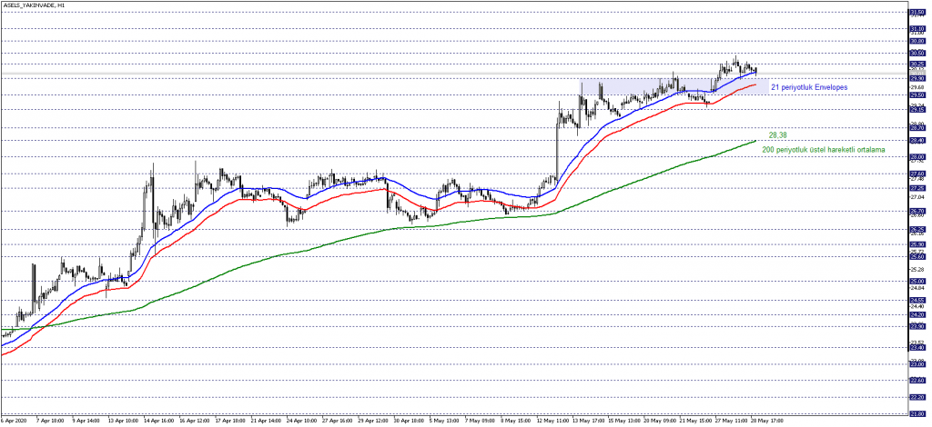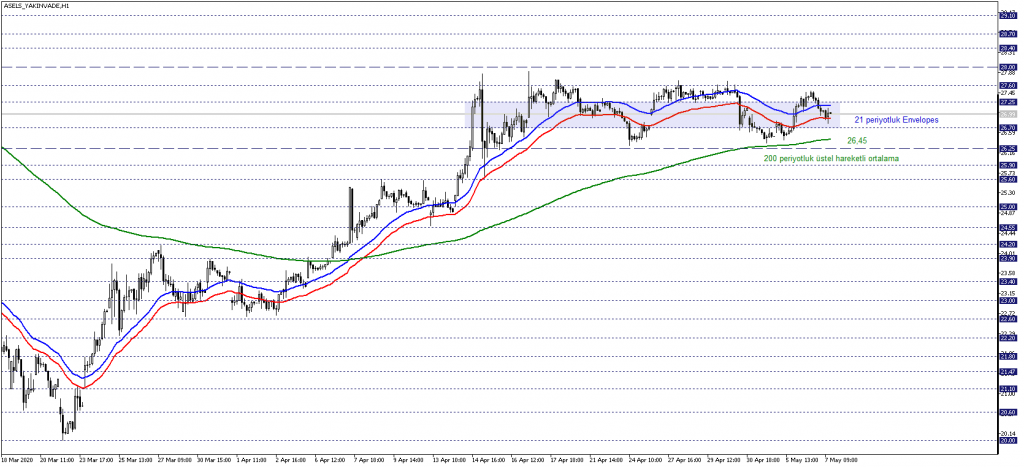 ASELS yakın vade sözleşmesini teknik olarak değerlendirdiğimizde 21 periyorluk Envelopes’un desteklediği 26,70 – 27,25 bölgesini takip etmekteyiz. Fiyat 26,70 – 27,25 bölgesi içerisinde oluşmayı sürdürdükçe, karar aşaması senaryosu geçerli olabilir.