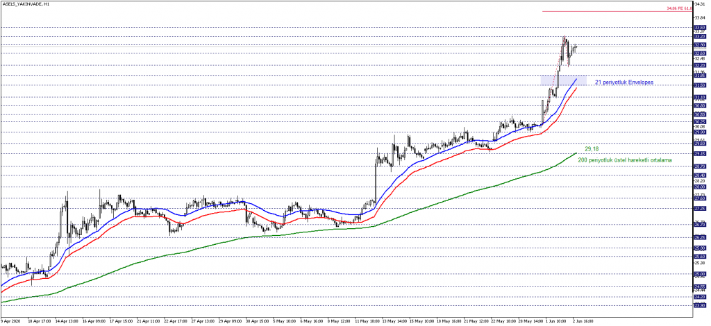 ASELS yakın vade sözleşmesini kısa vadeli teknik açıdan incelediğimizde 21 periyotluk Envleopes’un desteklediği 31,50 – 31,85 bölgesini takip etmekteyiz. Fiyat 31,85 seviyesi üzerinde oluşmayı sürdürdükçe, pozitif yönlü beklenti ön planda olabilir. Yukarı yönlü hareketin devam etmesi halinde 32,90 seviyesi takip edilebilir. Bu seviyenin aşılması durumunda 33,20 ve 33,50 seviyelerine doğru çıkışlar gündemi meşgul edebilir.