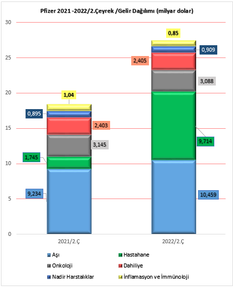 Pfizer'in faaliyet alanı altı iş bölümünden oluşuyor: Onkoloji, Nadir Hastalıklar, Hastane, Aşılar, Inflammation & Immunology ve Dahiliye. İkinci çeyrekte, aşı satışlarından elde edilen gelir 2021'in ikinci çeyreğine göre %13 artışla 10,45 milyar dolar oldu. Böylece aşı geliri, yıldan yıla artış gösteren diğer gelir kalemi olan nadir hastalıklar geliri ile birlikte şirketin ikinci çeyrek gelirinin üçte birinden fazlasını oluşturdu.