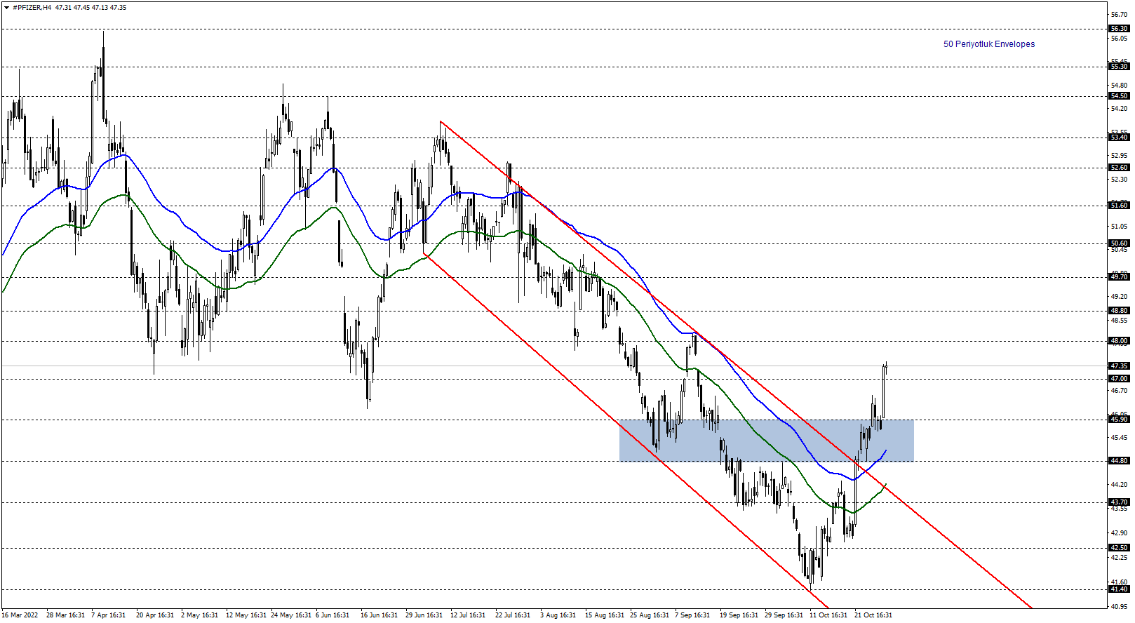 Pfizer hissesinin kısa vadeli fiyatlamalarını teknik açıdan incelediğimizde, 50 periyotluk envelopes’in desteklediği 44,80 – 45,90 bölgesini takip ediyoruz. Fiyat ilgili bölge üstünde seyrettiği sürece pozitif beklenti ön plana çıkmaktadır. Yükselişin devamında 48,00 – 48,80 seviyelerine doğru toparlanmalar gündeme gelebilir.