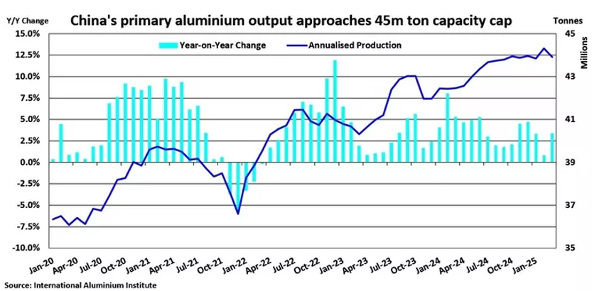 Avrupa’daki enerji krizi, alüminyum üretimini baltalamaya devam ediyor. Elektrik yoğun bir sektör olan alüminyum üretimi, yüksek enerji maliyetleri yüzünden Avrupa’da sekteye uğruyor. Çin ise küresel üretimin %60’ını sırtlayarak lider konumunu koruyor, ancak burada da bir dönüm noktası yaşanıyor. Çin hükümetinin 45 milyon ton/yıl üretim tavanına ulaşılmış durumda; Ağustos 2025 itibarıyla üretim 44,5 milyon ton seviyesinde. Hükümet, bu sınırı artırmayacağını net bir şekilde ifade etti. Bu, 20 yıllık kesintisiz üretim artışının sonuna işaret ediyor. Karbon nötr hedefleri ve kapasite kısıtlamaları, Çin’in ucuz hidroelektrik ve kömür avantajını gölgeliyor. Ancak hükümetin ısrarı dışında, bu kapasitenin artırılma ihtimali de piyasalarda tartışılıyor. Aşağıda Çin’in yıllıklandırılmış üretimi (mavi) ve yıllık üretim değişimi (yeşil) görülebilir. (Kaynak: Uluslararası Alüminyum Enstitüsü)