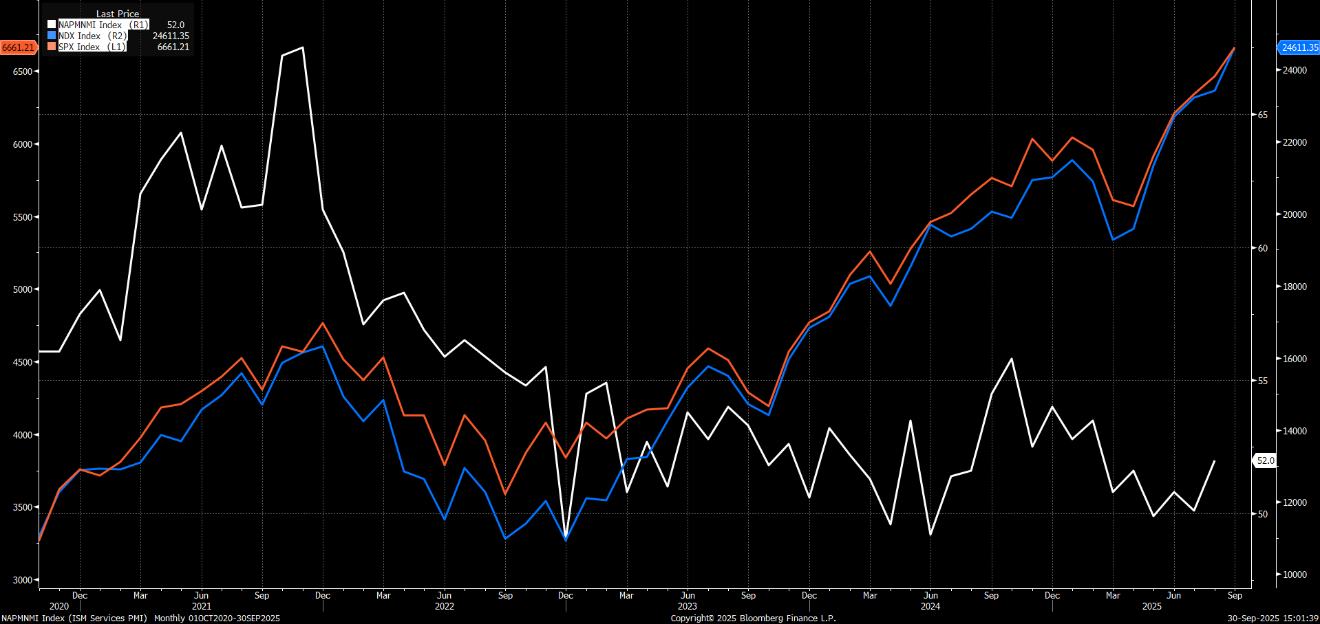 Grafik: ISM hizmet PMI, NASDAQ100 (mavi) ve S&P500 (turuncu)
