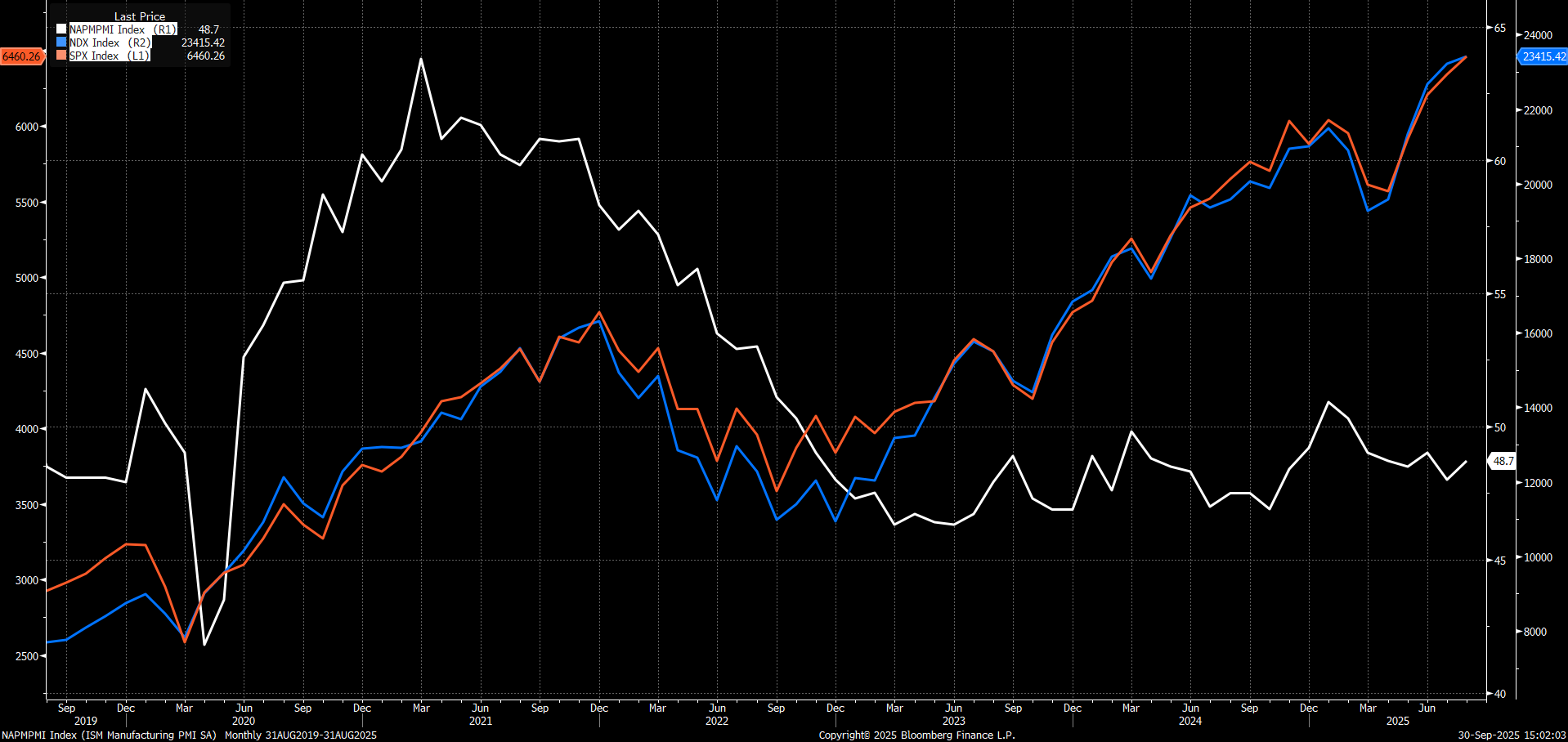 Grafik: ISM imalat PMI, NASDAQ100 (mavi) ve S&P500 (turuncu)