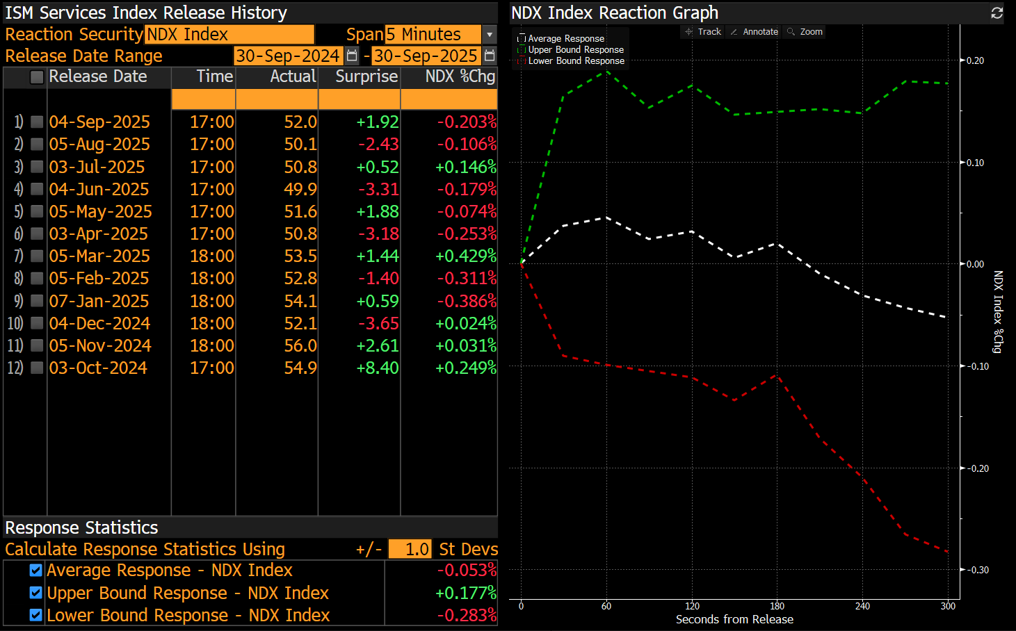 Kısa dönemde; açıklanan veri ile NASDAQ100 arasındaki etkiyi 5 dakikalık dönemde incelediğimizde; son 1 yıllık dönemde açıklanan ISM hizmet PMI verileri, ortalama %0,053 oranında baskıya neden olmuş gözüküyor. Burada beklentiden pozitif ve negatif yönde sapan veriler yer alsa da uzun dönemli korelasyonun etkisinden bahsedilebilir.