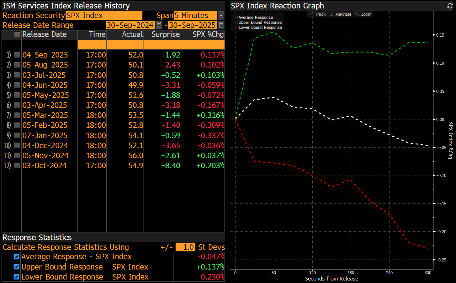 Aynı veri setini S&P500 için incelediğimizde de ISM hizmet PMI verisi açıklanması ardından geçen 5 dakikada endeks üzerinde %0,047 oranında negatif yönlü bir etki görüyoruz.