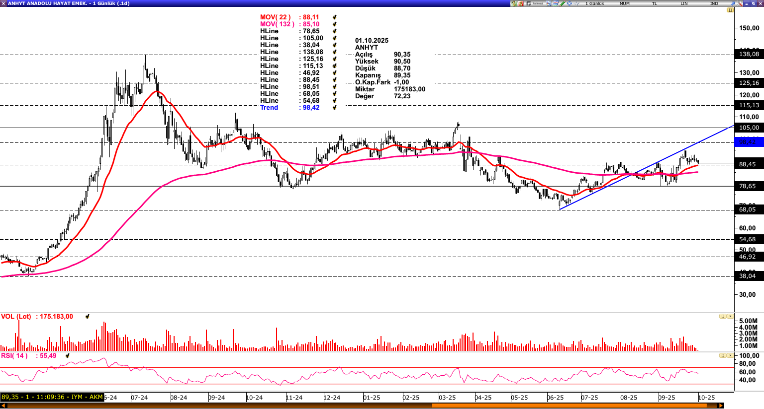 ANHYT: Son dönemde 88,45 seviyesindeki dirençten satış baskısı gören ANHYT, 78,65 seviyesinden bulduğu destekle toparlanma eğilimi göstererek hem 132 hem de 22 günlük hareketli ortalamaların yanı sıra 88,45 direncinin de üzerinde bir seyir izlemektedir. Bu bölgenin üzerinde kalıcılığın sağlanması durumunda, pozitif görünüm güç kazanarak fiyatın 98,42 seviyesine doğru ivmelenmesini sağlayabilir. Söz konusu direncin aşılması, yukarı yönlü hareketin devam etmesini destekleyerek 105,00 ve 115,13 seviyelerini gündeme getirebilir. Olası geri çekilmelerde 22 günlük ortalamanın geçtiği 88,45 seviyesi önemli bir eşik olarak öne çıkmaktadır. Bu seviyenin altına sarkılması durumunda ise düzeltme hareketi derinleşebilir ve fiyatlamalar yeniden 132 günlük ortalama ile 78,65 destek bölgesine doğru geri çekilebilir.