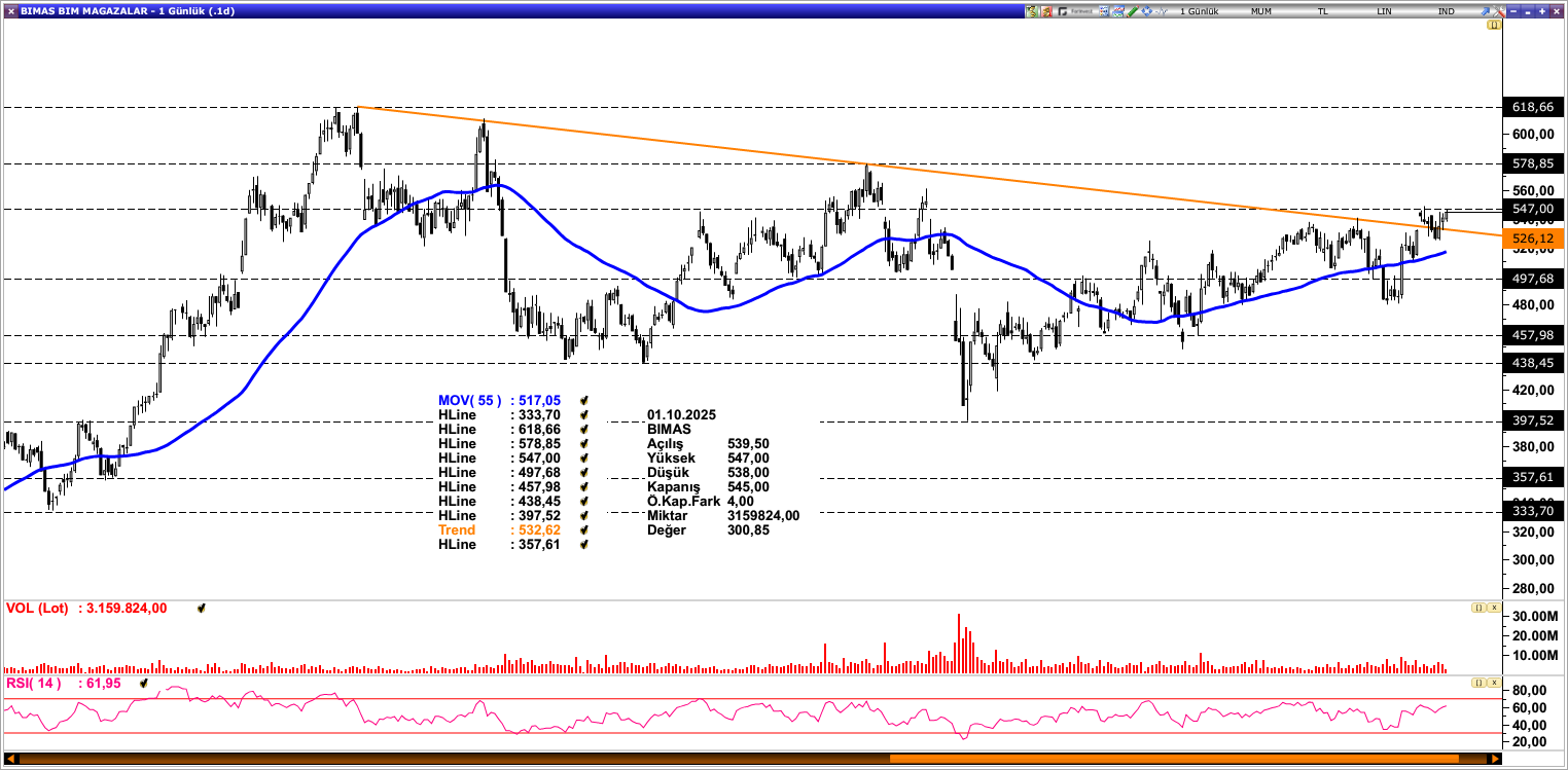 BIMAS: Uzun süredir turuncu renkli düşen trend çizgisinden baskı gören BIMAS, son dönemde yakaladığı pozitif ivme ile bu düşen trendin üzerine çıkarak yukarı yönlü fiyatlamalar sergilemeye başlamıştır. Bu trend çizgisinin üzerinde kalıcılığın sağlanması, teknik görünüm açısından olumlu bir tabloyu destekleyebilir ve alım iştahının artmasına zemin hazırlayabilir. Mevcut pozitif seyrin korunması halinde, hissede ilk aşamada 578,85 seviyesine doğru bir hareketin devam etmesi beklenebilir. Bu direncin de aşılması durumunda, TL bazlı tarihi zirve seviyesi olan 618,66’nın yeniden gündeme gelmesi mümkün olabilir. Olası baskılanma hareketlerinde trend çizgisi kritik destek olurken altında fiyatlamalar baskıyı 50 günlük ortalamaya doğru derinleştirebilir. Mevcut konjonktürde enflasyonda kademeli geri çekilmenin devamlılığı ve Merkez Bankası’nın da enflasyona uyumlu şekilde adım atacağı beklentileri hisse üzerinde destekleyici etki yaratabilir.