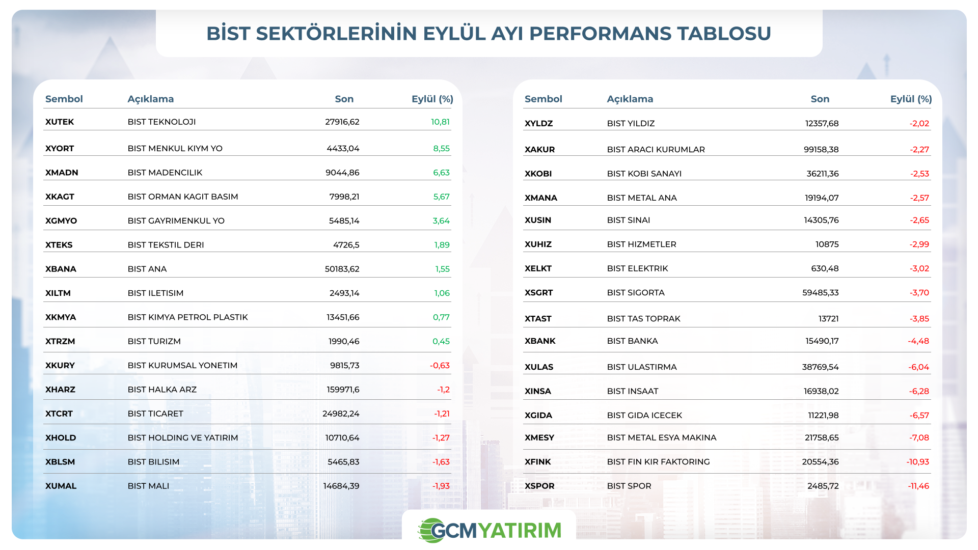 Eylül ayında sektör görünümlerinde de negatif seyrin ön plana çıktığı görülmektedir. Özellikle ana sektör endekslerine bakıldığında XBANK %-4,48, XUSIN %-2,65, XHOLD %-1,27 ve XUHIZ %-2,99 tarafında yaşanan kayıpların BİST100 endeksi üzerinde de baskı yaratan önemli bir unsur olduğu görülmektedir.