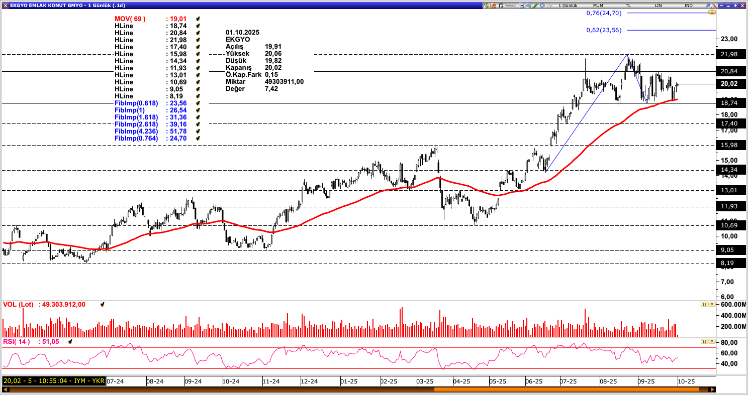 EKGYO: 18,74 – 20,84 bölgesinde bant hareketi sergileyen EKGYO, 69 periyotluk ortalamadan aldığı destekle iyimser görünümünü sürdürmektedir. Ortalama üzerinde fiyat hareketlerinin devam etmesi ilk etapta 20,84 seviyesine doğru hareket alanı oluşturabilir. 20,84 seviyesi üzerinde kalıcı fiyat hareketleri izlenmesi 21,98 ve 23,56 seviyesine doğru yükselişi destekleyerek yeni TL bazlı zirve seviyelerine doğru hareket akışı sağlayabilir. Olası baskılanmalarda ise 69 günlük ortalama bölgesi güçlü destek olurken altında fiyatlamalar baskıyı 17,40 seviyesine doğru derinleştirebilir.