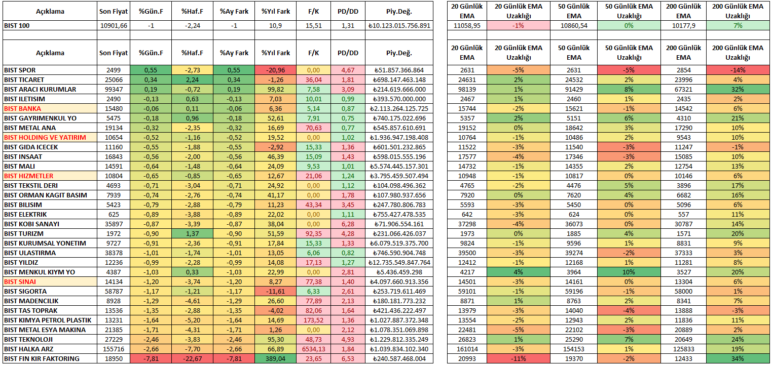 Aşağıdaki tablo 1 Ekim 2025 piyasa açılışından sonraki verileri kapsamaktadır. Mevcut görünümde BİST100 endeksi ve 4 ana + 27 alt sektörün ilgili ortalamalardan uzaklıkları görülmektedir. Trendlerin momentumunu ya da olası riskleri değerlendirebilmek adına farklı bakış açısı sağlayabilir.